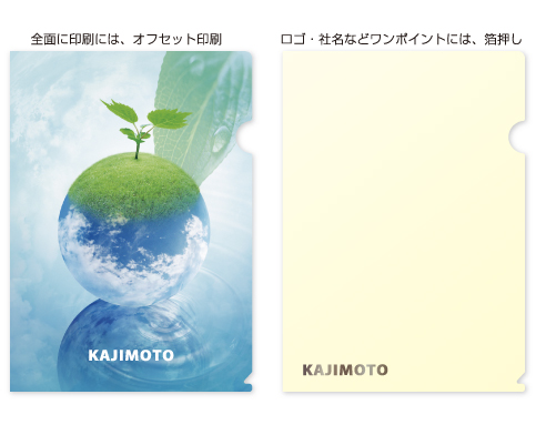 クリアファイルの作成にあたり、デザインする内容に合わせた印刷方法を2種類ご用意しました。箔押しは会社のロゴや住所などをワンポイント印刷に最適。全面フルカラー印刷がしたい場合は、オフセット印刷をお選び下さい。全面の写真ファイルなど自由にデザイン可能です。